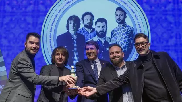 El delegado del Gobierno, Pedro Fernández, hace entrega del galardón a los miembros del grupo jienense Supersubmarina / Raul Caro (EFE)