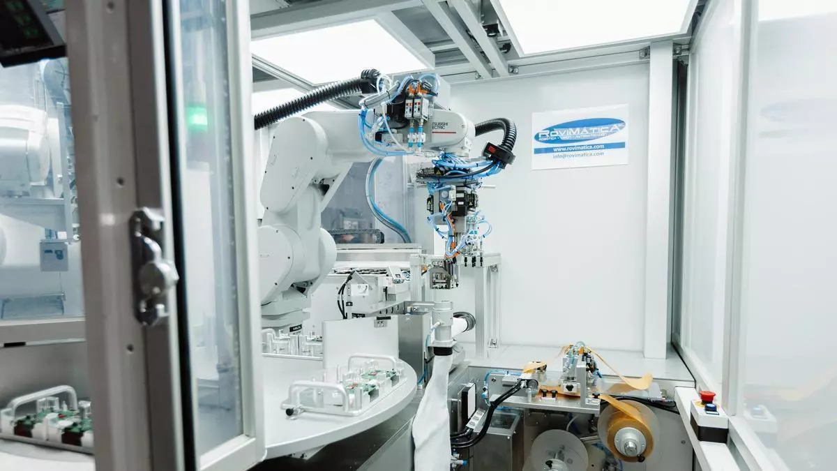 La empresa andaluza Rovimática destaca por su capacidad tecnológica para crear equipos y sistemas de robotización y automatización. En la imagen, su célula robotizada que empaqueta en 'blisters' placas electrónicas y que incluye un sistema de control de calidad por visión artificial. / El Correo