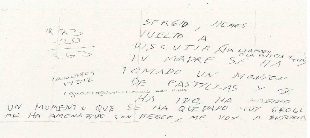 "Sergio, hemos vuelto a discutir. Tu madre se ha tomado un montón de pastillas y se ha ido. Ha habido un momento en el que se ha quedado muy grogui y me ha amenazado con beber. Voy a buscarla.". La nota la encontró Sergio, el hijo mayor de Juana. La firmaba el novio de su madre, Jesús Pradales. Ese escrito en un trozo de papel es lo único que encontró cuando el joven llegó a casa -tras pasar la noche en casa de un familiar- y no había nadie allí".
